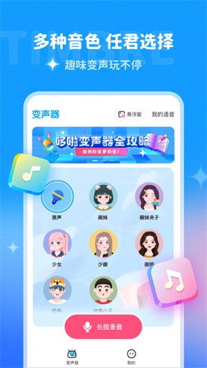 多啦变声器1.71旧版本是一款变音软件。软件内为用户提供海量的变声声音,多种音色任你挑任你选,音色风格一应俱全,萌妹音、奶狗音、气泡音、御姐音等等应有尽有,还提供超多变声器攻略,让用户趣味变音玩不停!还能进行悬浮窗便捷操作,随心所欲即录即用。