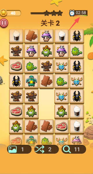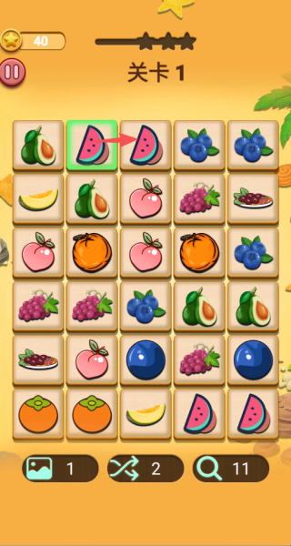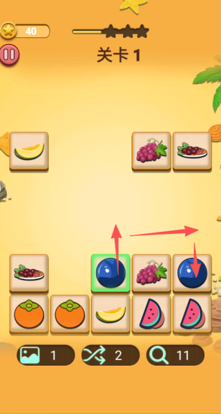 1、进入关卡1,点击相同的水果,将它们进行消除。