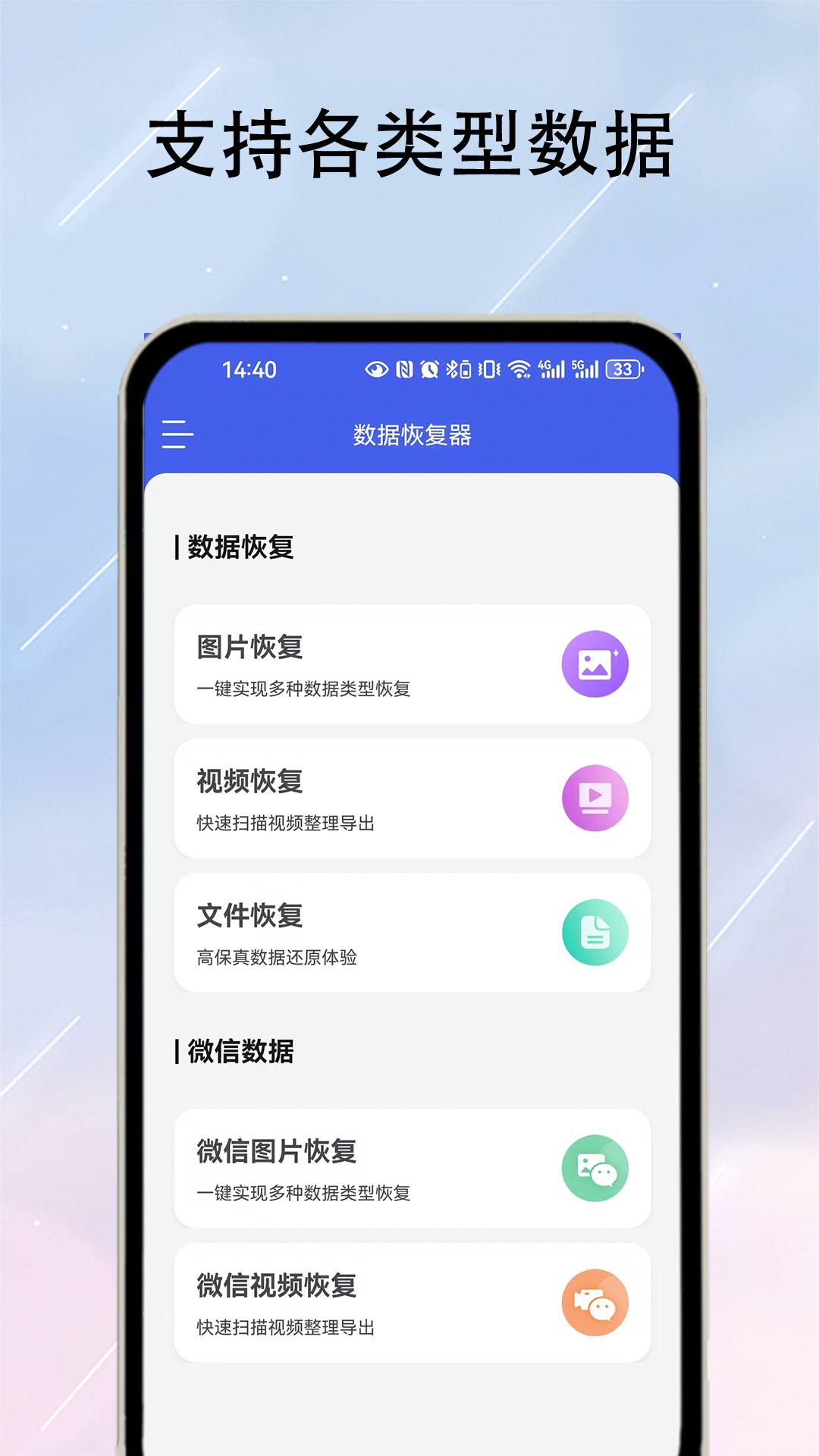 数据恢复器是一款专业的手机数据恢复助手。软件内支持恢复手机中的照片、文件、视频、聊天记录等,方便又实用。有了这款软件就算重要数据被误删也不用害怕,他能轻松帮助用户找回删掉的数据。软件内还支持对文件格式进行转换,高效又便捷。