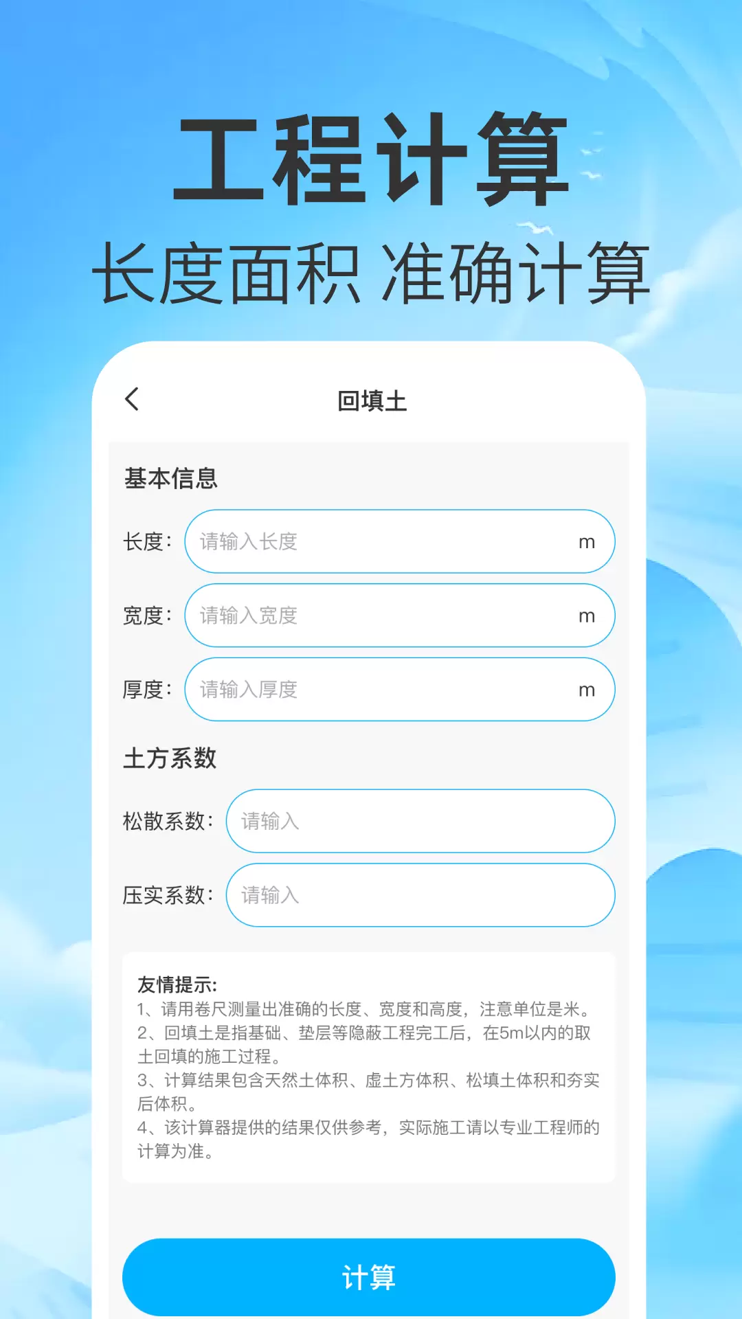 整合回填土、长方体等常用计算,输入参数,获得即时的数据。