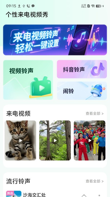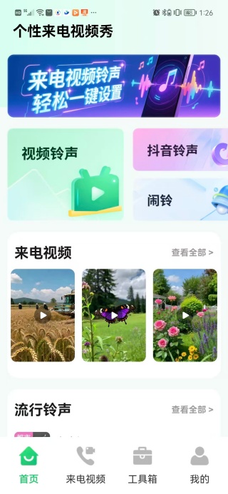1、在首页中提供视频铃声、抖音铃声、闹钟,同时了解来电视频和流行铃声;