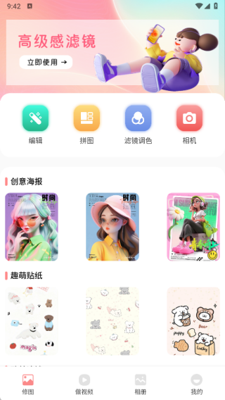 1、在修图页面中提供了编辑、拼图、滤镜调色、相机以及创意海报、趣萌贴纸等功能;