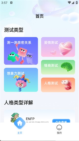 2. 在主页面即可看到亲密关系测试、想象力测试、爱情测试等功能;