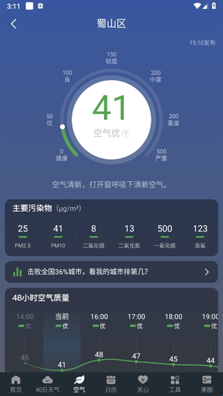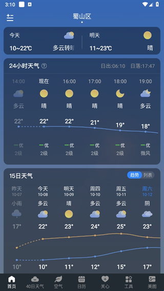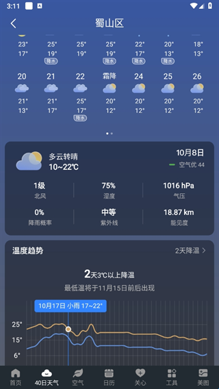 2、超长40天预报:查看40日天气日历、未来降温/降雨趋势曲线图,提前掌握天气信息,为出行早做计划。