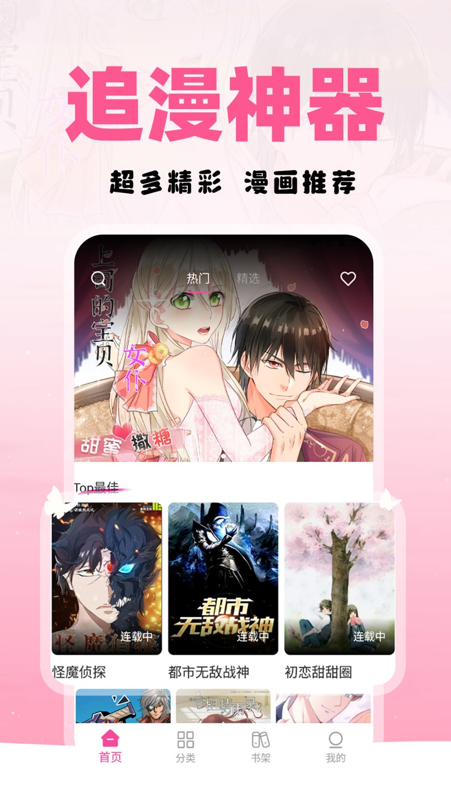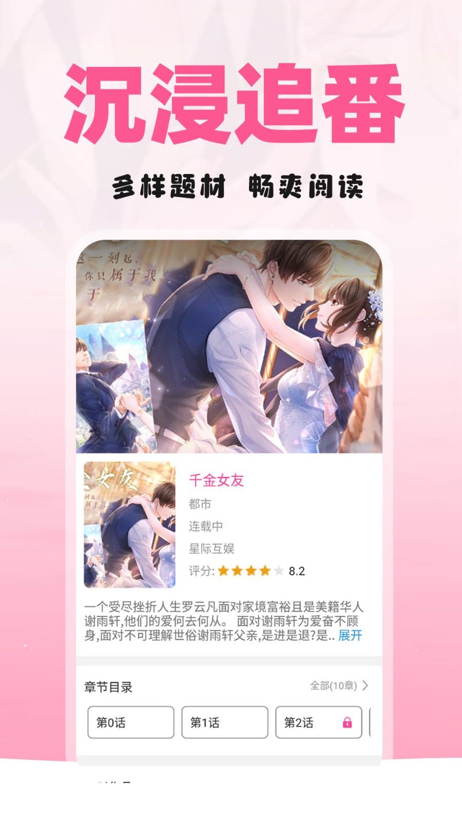 免费漫画多多是专为漫画爱好者打造的追漫神器。软件内为用户提供海量正版免费漫画资源。甜蜜撒糖、国风漫画、现言偶像、热血漫画等都应有尽有,超多精彩内容等你来看!喜欢的作品还能一键收藏至书架哦!更新时会为你弹窗提醒,再也不怕错过追更啦!