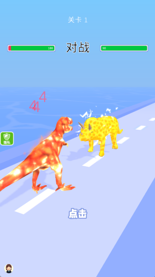 4、决战机制:抵达关卡终点后进入强制战斗环节,通过点击屏幕即可让己方恐龙去攻击对手,点击速度越快攻击频次就会越多。