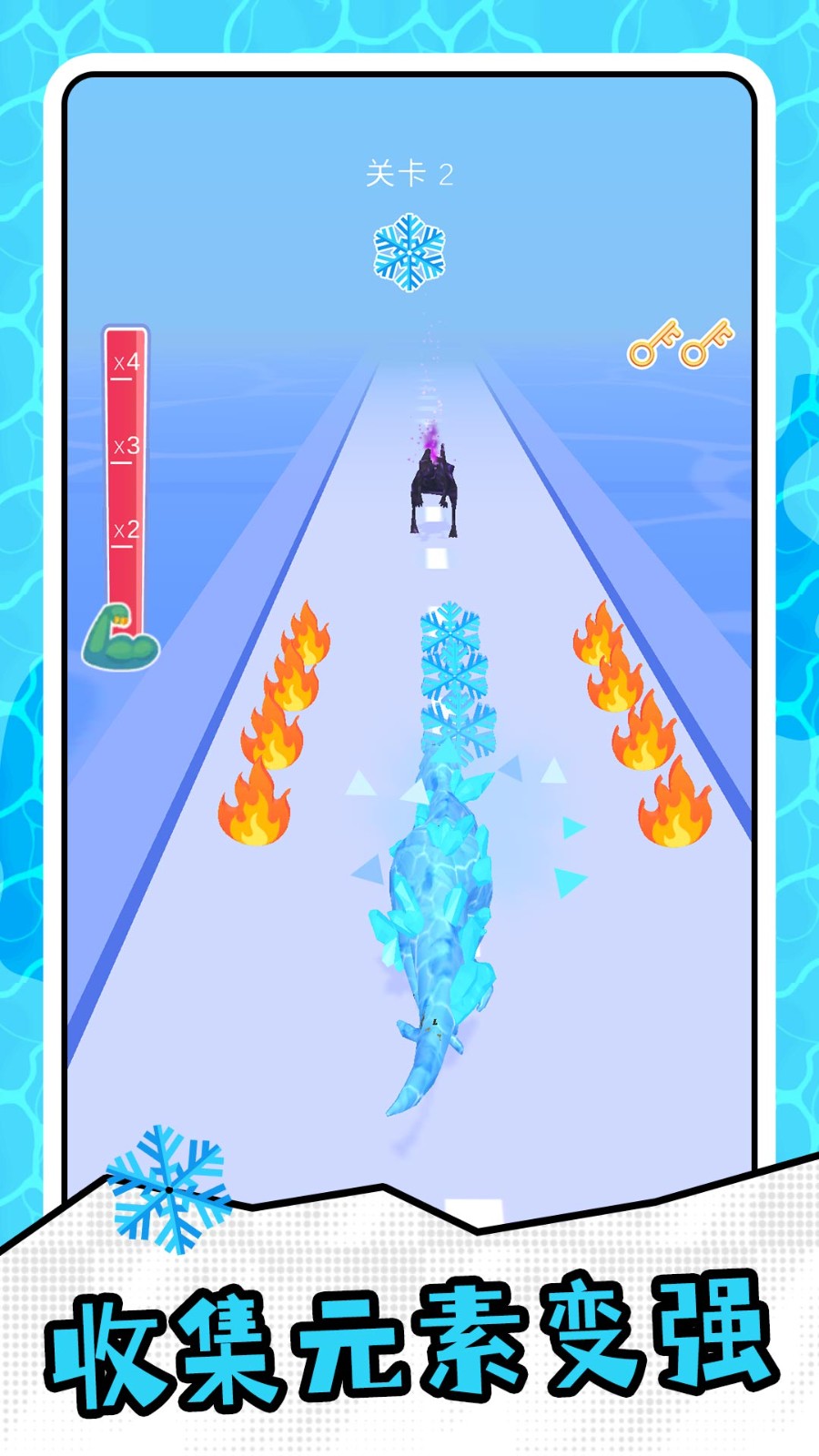 2、核心目标:玩家操控恐龙在关卡中前进,通过收集元素强化属性,并在终点与BOSS展开战斗,最终以元素积累量决定胜负概率。