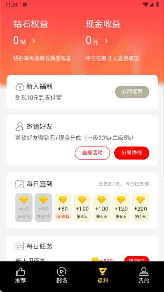 3、在福利页面中可以了解钻石收益和现金收益,还有新人福利、每日签到以及每日任务等内容;