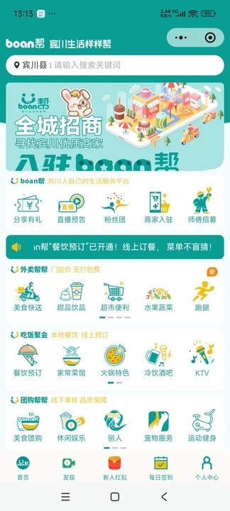 汇集了同城范围内的各类优质商家,用户点击boan帮,会自动帮用户定位,根据用户需求提供美食快送、帮买帮取、上门维修等服务。