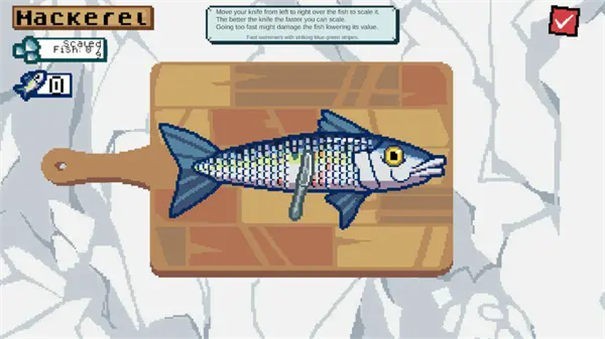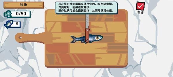 3、成功钓到后,玩家可用刀具来刮鱼鳞,但是注意不要刮太快,以免破坏鱼皮;
