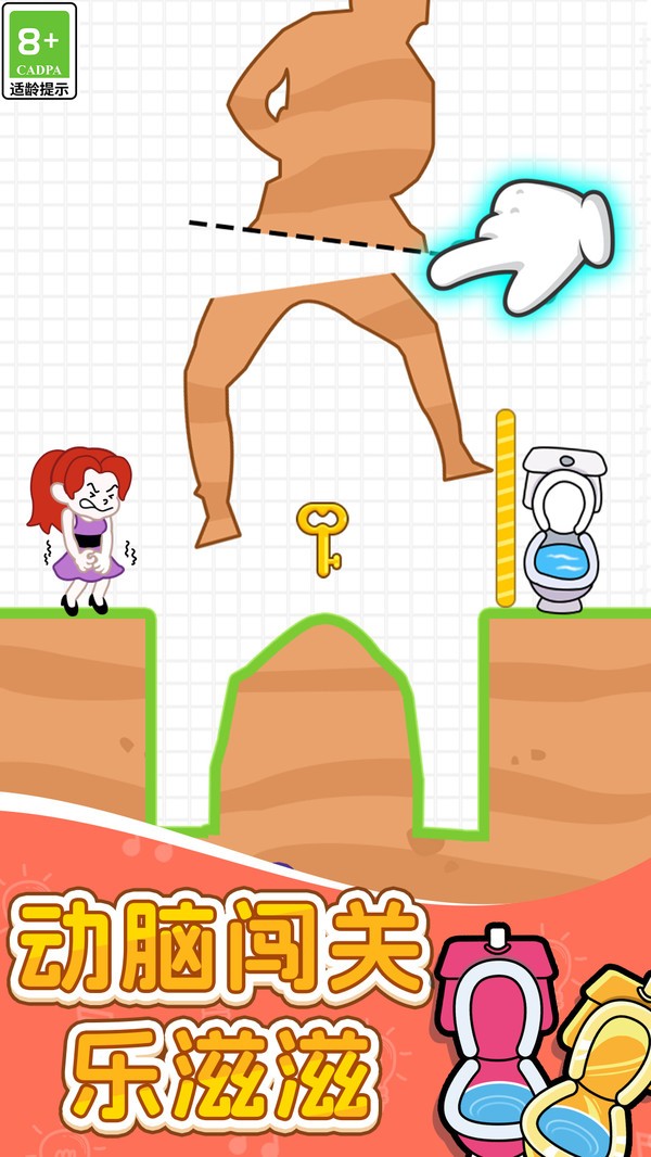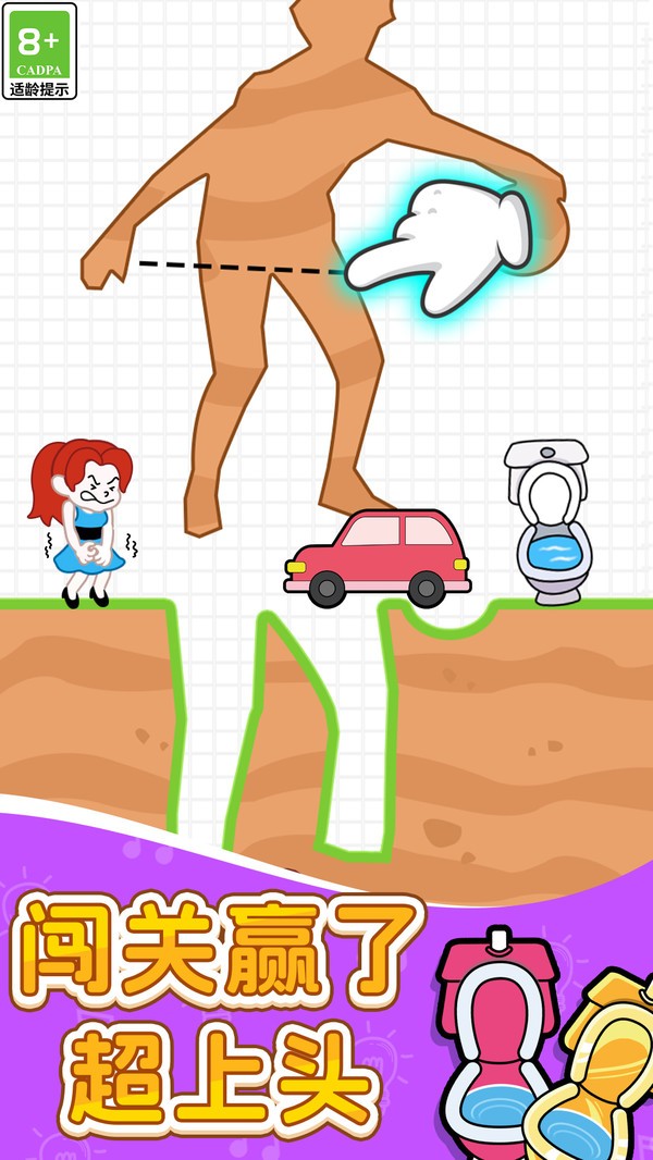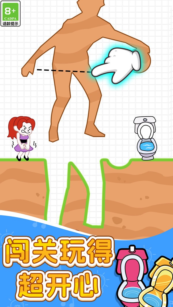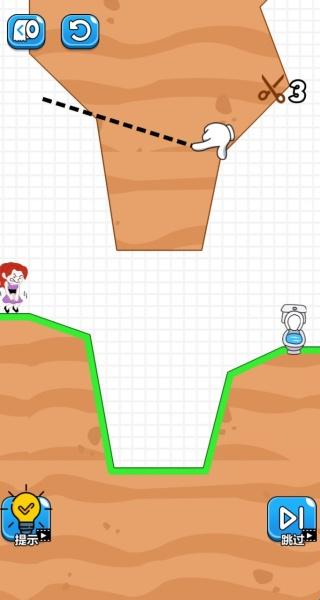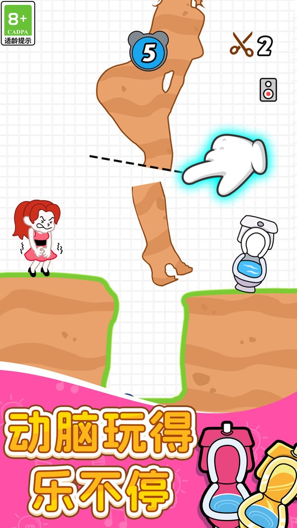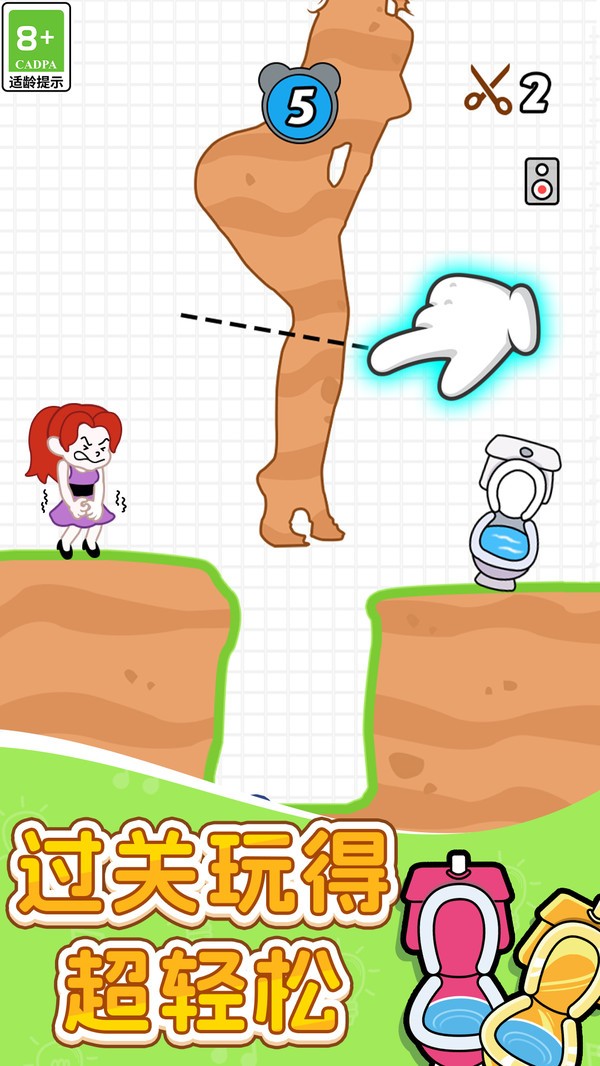3、第一关有指示,你只需要根据操作去画线切割,就可以成功的帮助主角上到厕所。