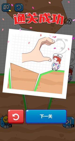 3、切割与填充:玩家需观察场景布局,通过画线切割物体,使其精准填补坑洼,确保小女孩顺利通过。