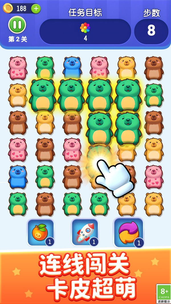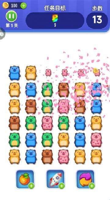 3、移动或者是点击连线卡皮巴拉,开始消除得到分数;