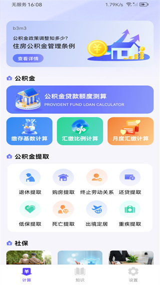 1、下载安装好软件之后打开,在首页可以看到缴存基数计算等各种功能;