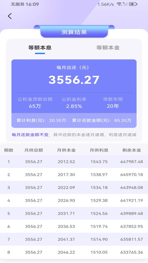3、输入你的数据即可计算出测算结果,包含了等额本息和等额本金等两种方式;
