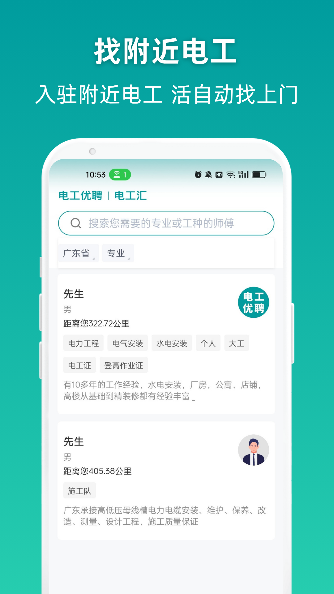 3、找附近电工功能可让用户快速匹配周边电工,电工也能自动获得附近工作机会。