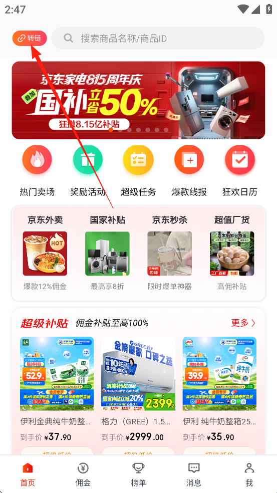 1、转链功能 一键转链,随时随地分享赚钱 打开京粉APP,点击首页左上角“转链”,粘贴您复制的商品文案链接,根据提示即可完成转链