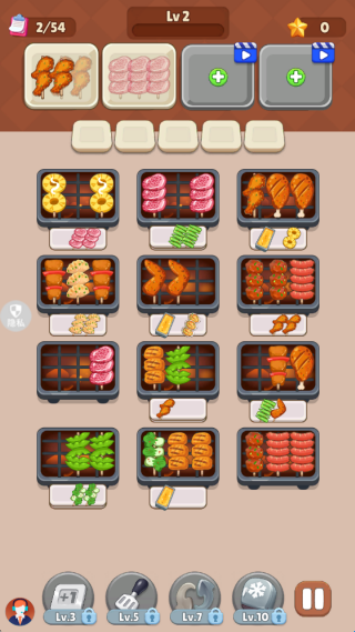 2、目标明确:通过匹配相同烤串完成关卡挑战,规则清晰易懂,适合全年龄段玩家轻松上手。