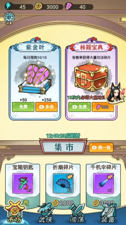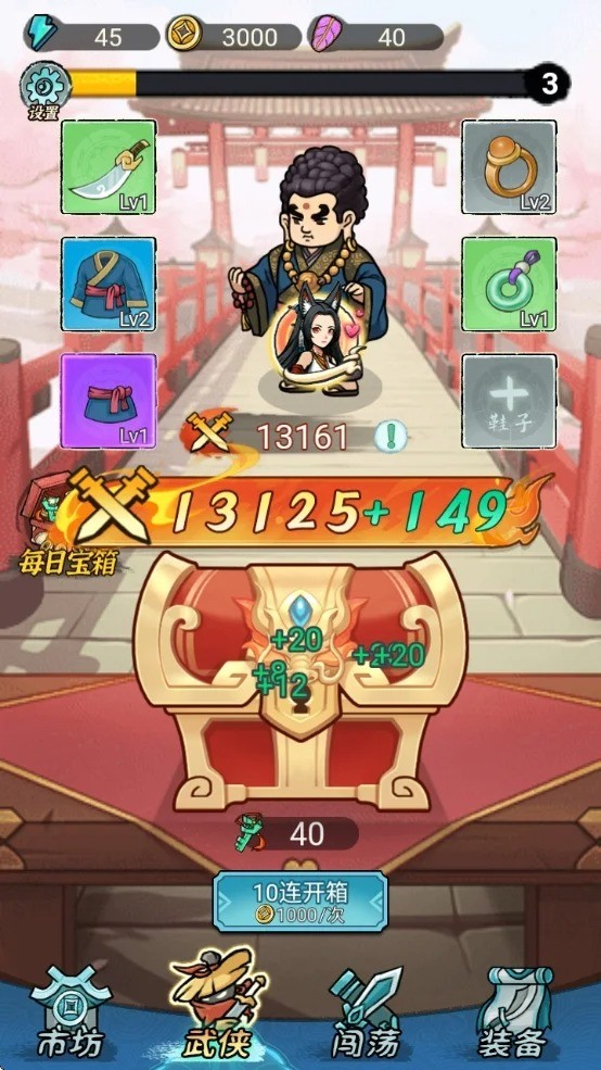 3、出来以后可以花费金币或者钻石来开启宝箱获取武器和功法,看广告也可以,小编已经免广告了哦