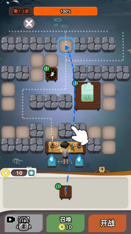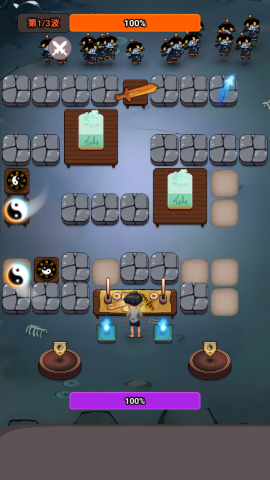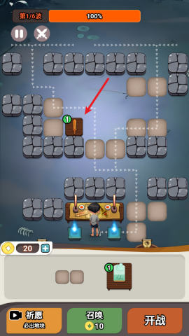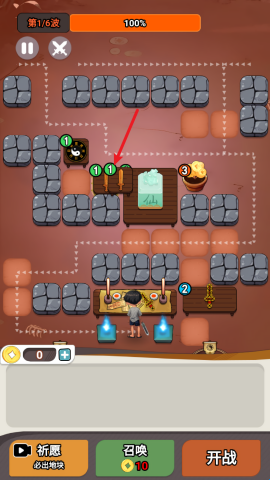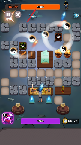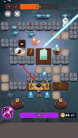 5、布置好之后就可以开始战斗了,过程中法器会自动攻击范围内的敌人,玩家可以点击主角来进行攻击。