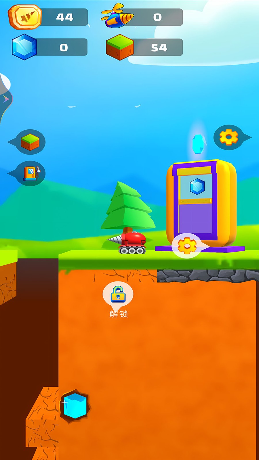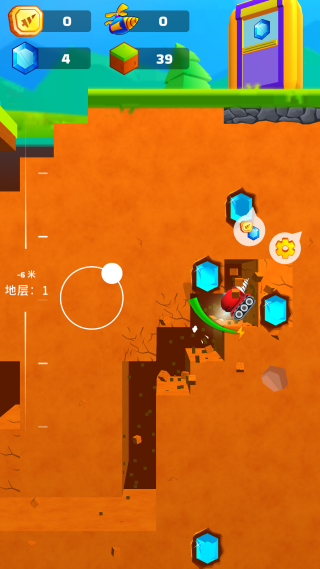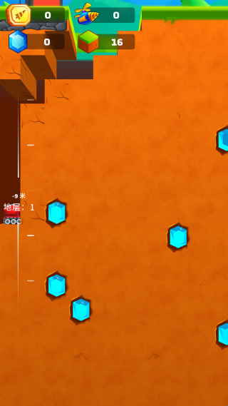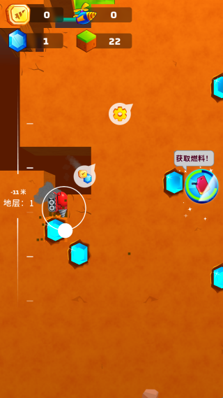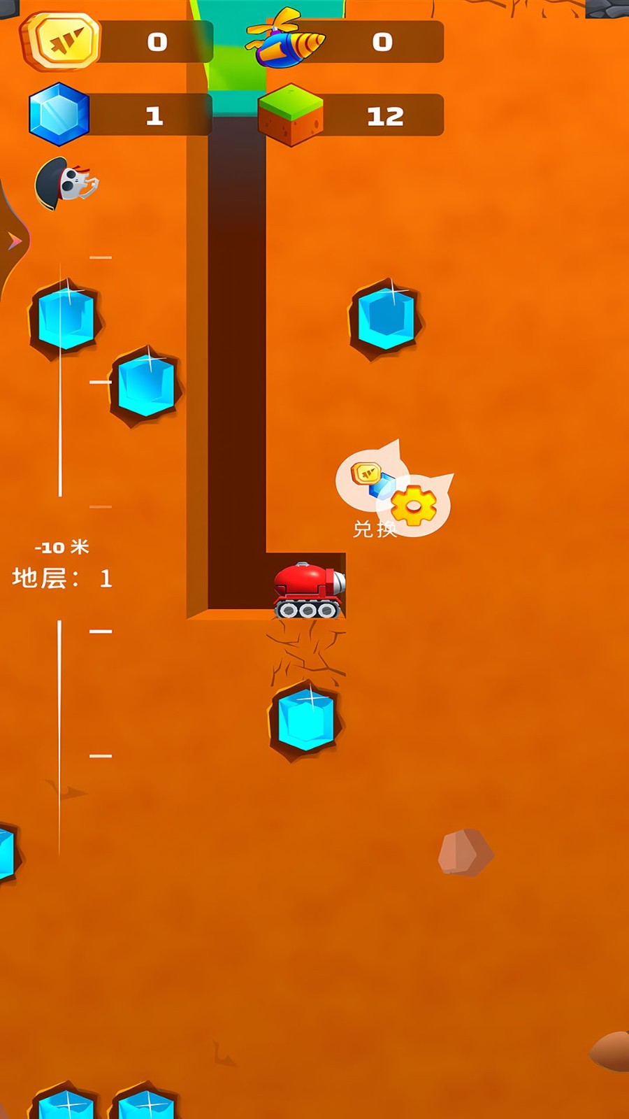 1、点击屏幕控制钻头向下挖掘,在不同地层中识别并采集各类矿产。