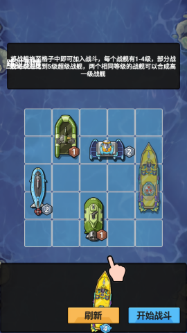 1、将战舰拖至格子中即可加入战斗,每个战舰有1-4级,部分战到5级超级战舰,两个相同等级的战舰可以合成高—级战舰