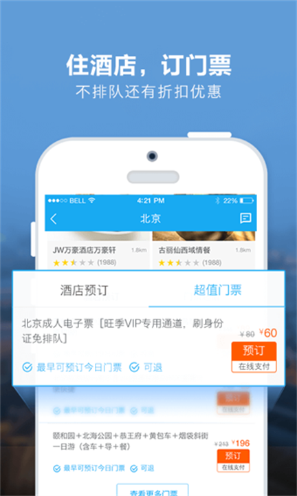 在线预订:全线接入一线OTA厂商的国内国际机票、门票、酒店数据,旅行预定,这里都可以实现。