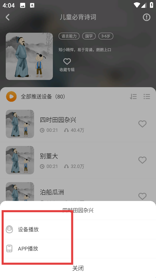 2、例如选择诗词内容后进入儿童必背诗词界面,每首诗词都有相应的播放时长和播放量,点击诗词后可选择设备播放或APP播放两种播放方式,方便在不同场景下使用。