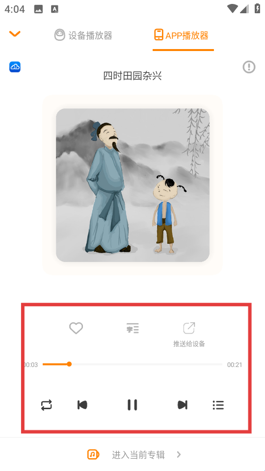 3、选择播放方式后进入播放界面,这个界面有播放控制栏,包括播放或暂停、上一首、下一首、音量调节等功能,还可以将诗词推送给设备,方便在其他设备上播放。