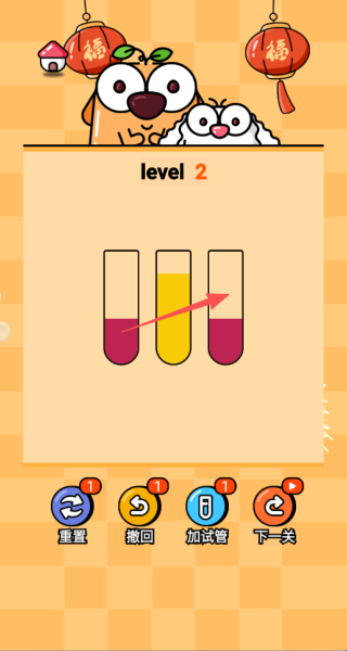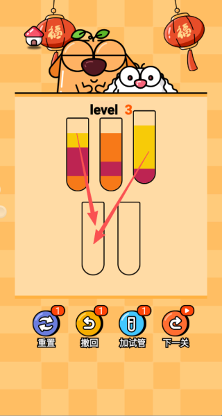 2、第 2 关有三个试管,将左右两个试管中的红色液体合并到同一试管。先点击左侧红色试管,再点击右侧红色试管,让红色液体满管,黄色液体留在中间试管,完成颜色分类通关。