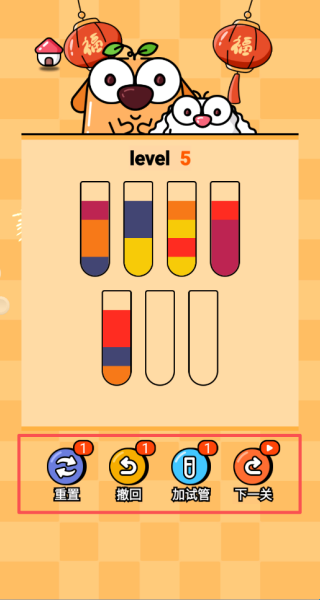 4、第 5 关颜色较复杂,可使用 “加试管” 功能增加空试管辅助分类。先分离出单一颜色(如红色),倒入空试管,再依次处理橙色、黄色、蓝色等,逐步将同色液体合并,最终完成所有颜色分类通关。