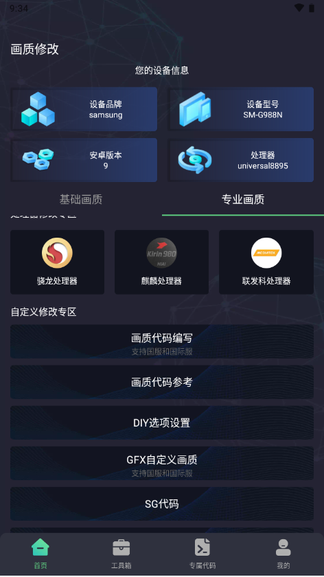 3、针对不同的手机型号会有不同适配的版本,在修改画质之前,需要选择自己手机的型号,还可以设置多种语言。