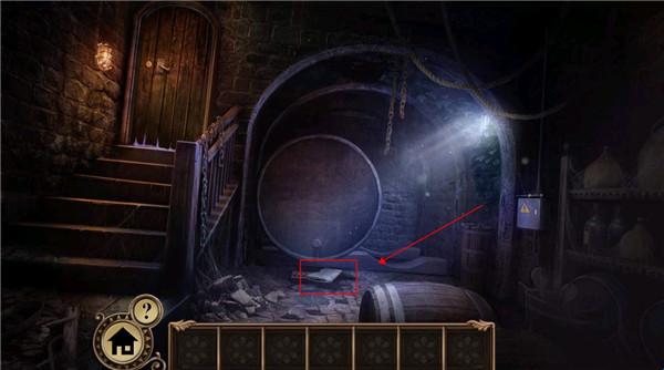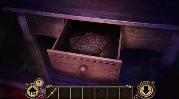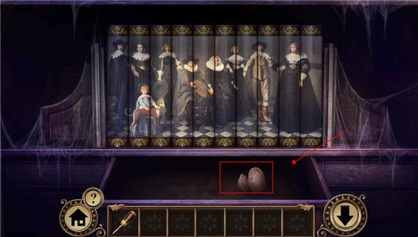 9、回到大厅往前走,点击右边的书架将刚才获得的书,放进去,然后调整书的顺序使上面的画拼接完整,获得抽屉把手。