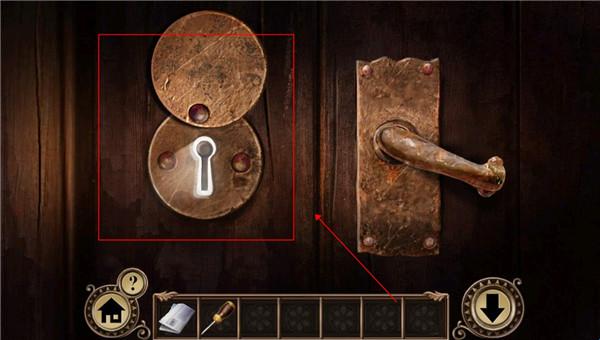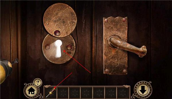 3、点击房间门把手,将钥匙洞贴片滑到上面,提示钥匙在外面我们返回。