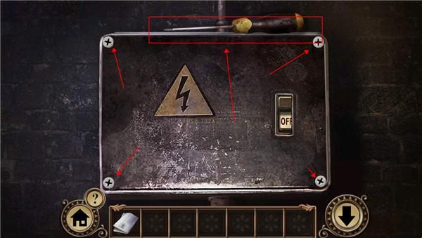 2、然后点击旁边的电箱,上面有个螺丝刀,用螺丝刀将四个螺丝卸下来,我们可以看见保险丝烧断了。