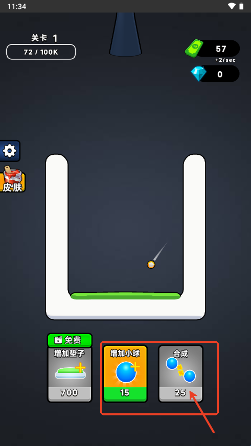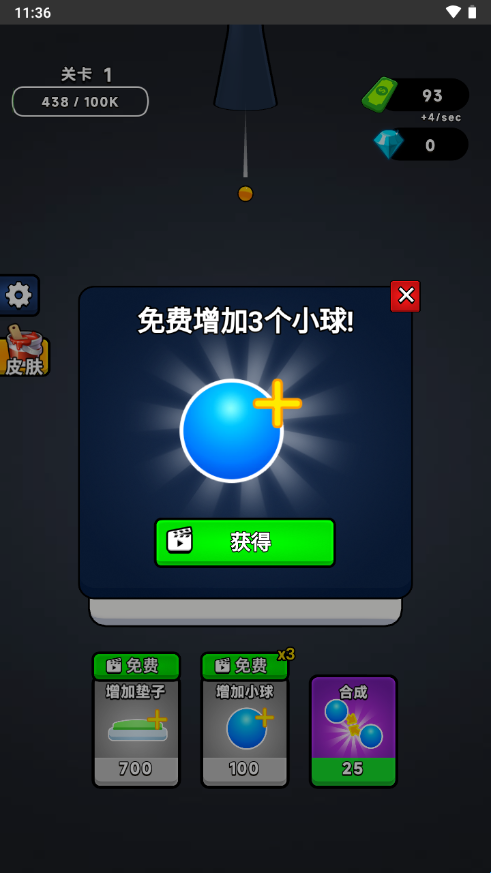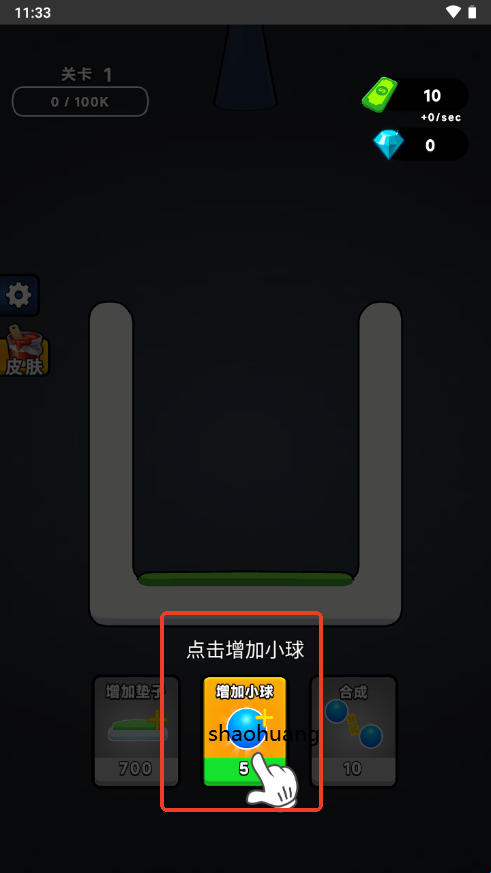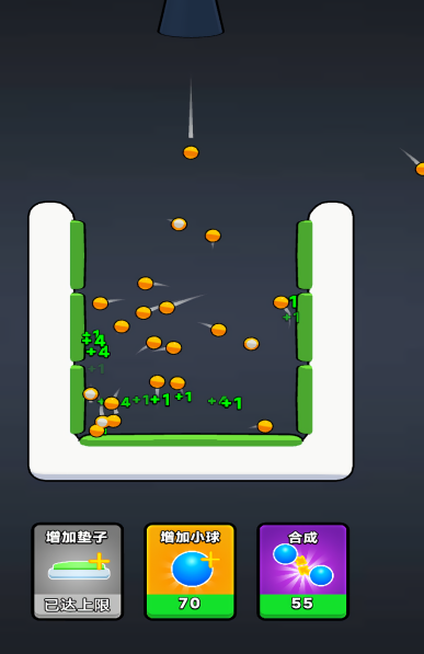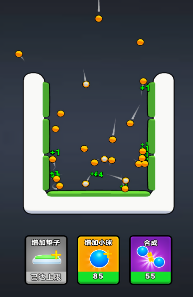 1、进入游戏点击增加小球,每一次弹跳会获取奖励