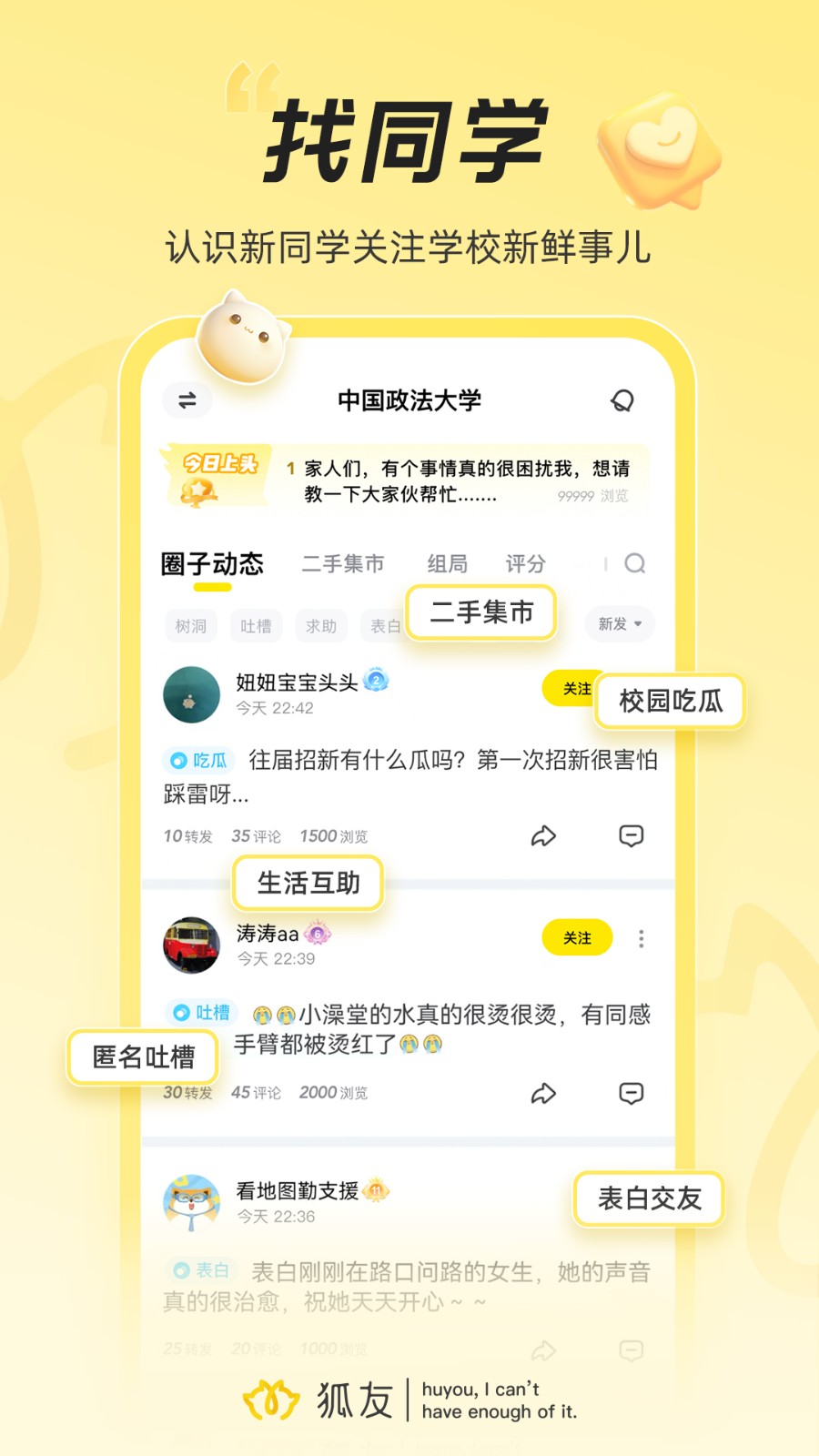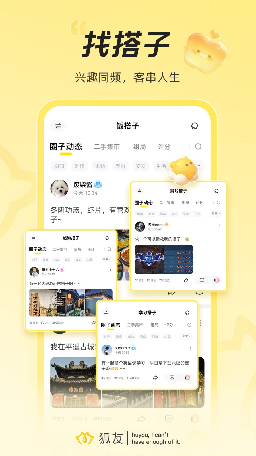 狐友是一款主要以找搭子为主的社交软件。软件内提供很多兴趣圈子,在这里你可轻松的找到与自己兴趣同频的人,不管是找同乡、找同好、找同学等等,这里都能够满足。软件内还能够发送各种各样的动态帖子,还有很多精选推荐,让你发现更多精彩内容!