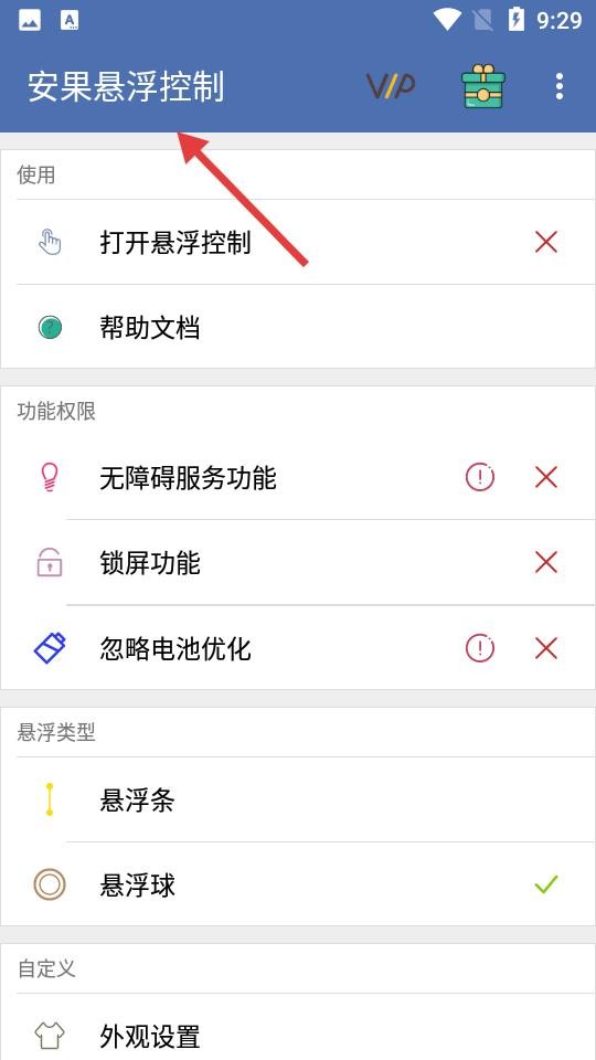 2、点击安果悬浮控制界面,支持开启悬浮功能,含帮助文档、功能权限设定,可选择悬浮条或球并自定义外观。