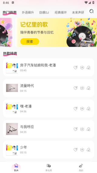 1、在铃声页面中有热歌铃声,还有外语飙升、劲爆DJ、经典循环等不同的分类;