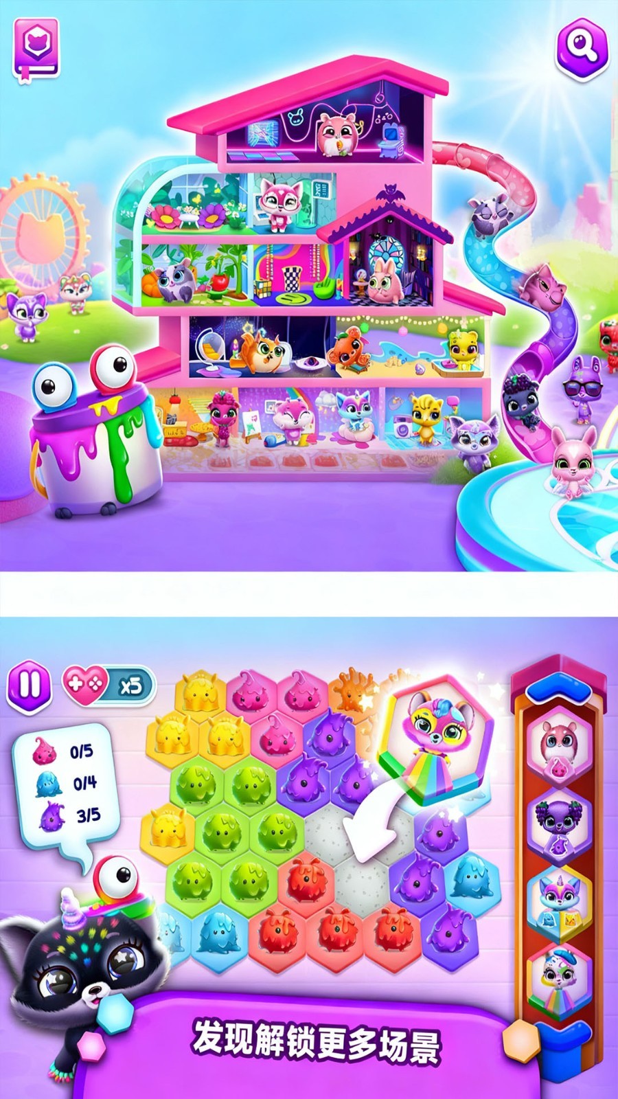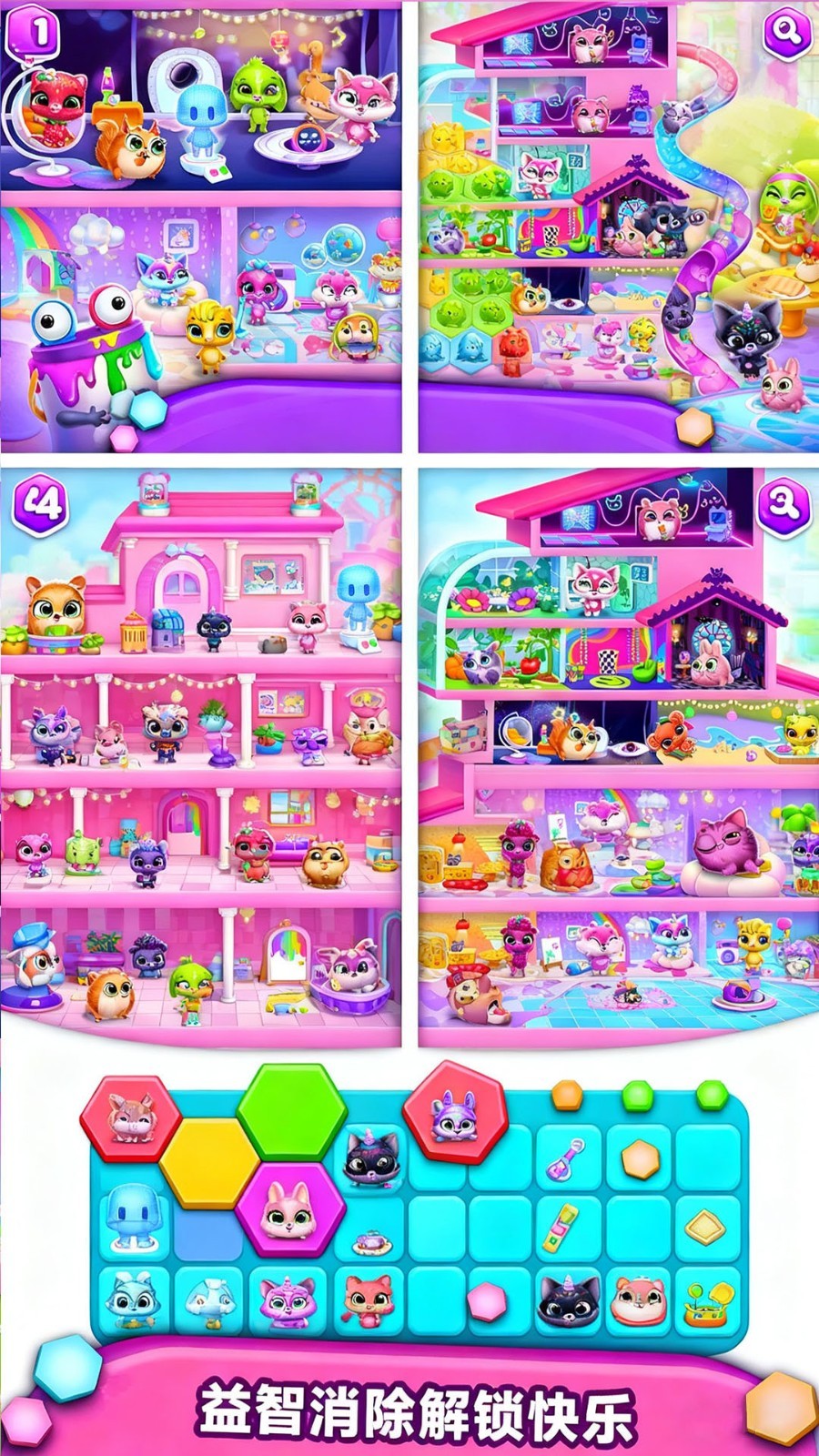 1、创新融合宠物收集与六角形消除玩法,打破单一游戏类型局限,在益智闯关的同时,享受收集萌宠的乐趣,玩法更具层次感。