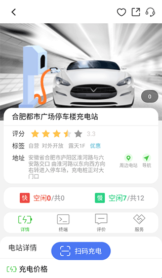 4、每个电站下方都有详情介绍具体的价格等信息,确定后点击下方的“扫码充电”;