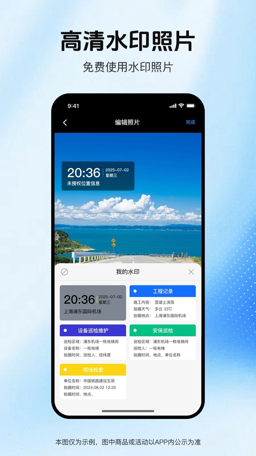 【专业水印模板】 考勤打卡:真实时间地点无法篡改 * 工作记录拍照:物业管理、建筑工程管理、执勤记录、品牌宣传、会议记录等工作记录专属模板 * 实时更新:水印可自动更新为实时的日期、地点、天气等信息 自定义水印内容:编辑工作内容、设置自己的纪念日、修改地点名称、编辑心情文字等