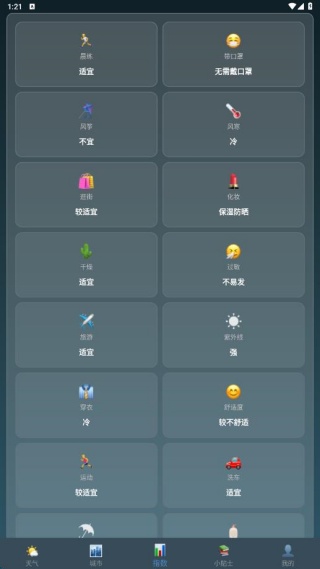 3、在指数页面,结合天气温度变化,展示更多生活宜忌事项,都是直接浏览,还能快速分享生活指数。