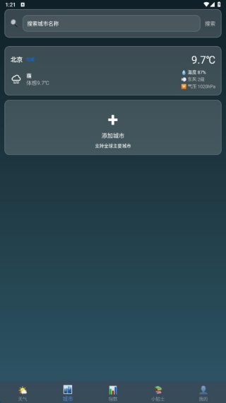 2、在城市页面,我们能快速添加多个城市位置信息,出差变换城市秒速更换。