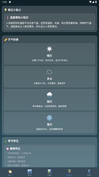 4、在小贴士页面,大家也能看到天气科普内容,不断阅读,积累更多气象知识。
