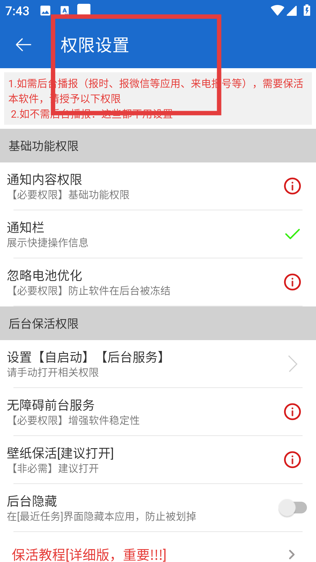 2、在APP我的页面找到基础设置区域,点击权限设置进入权限设置界面,这里罗列通知内容权限、后台保活权限等,按需开启通知栏、忽略电池优化等权限。