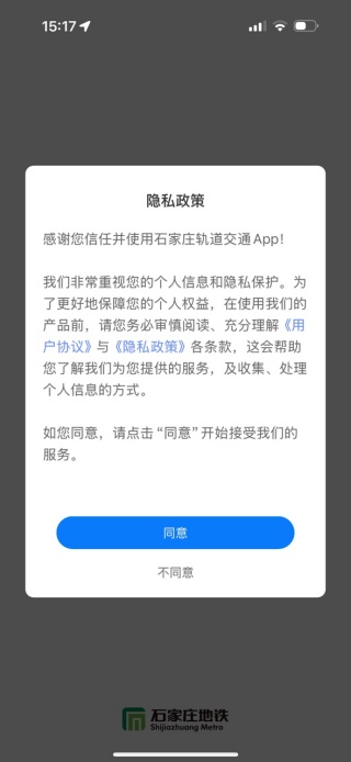 1、可以直接下载最新版本的石家庄轨道交通,进入的时候需要先同意隐私权限。