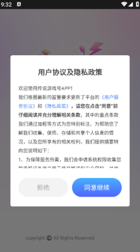 1、用户首先在橘子下载传说游戏号app,查看并同意隐私政策与用户协议。