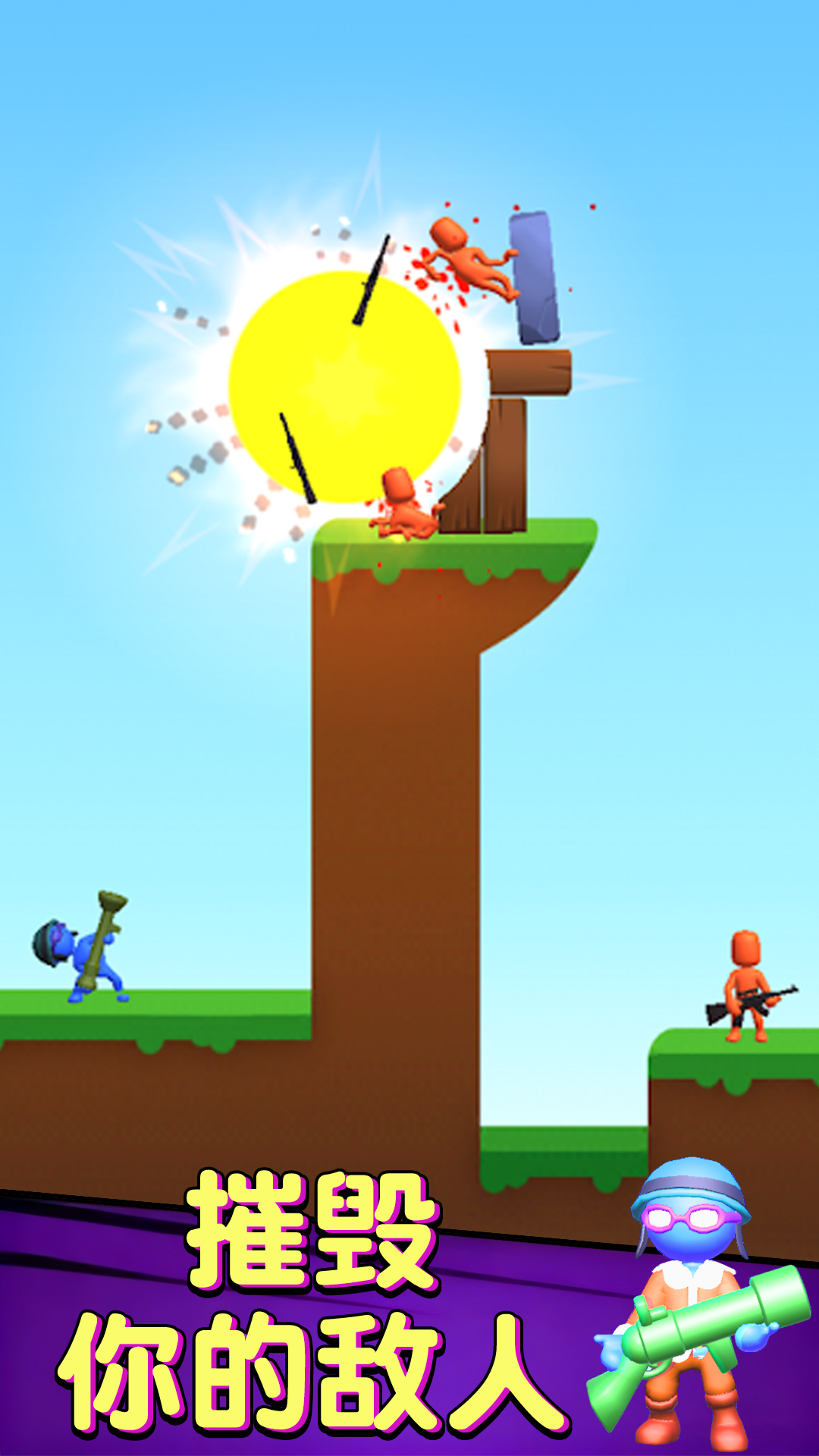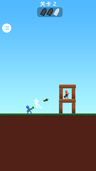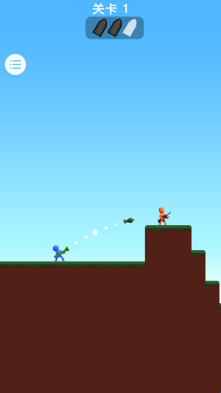 2、在关卡 1 中,拖动蓝色火柴人调整瞄准角度,预判红色敌人的位置,释放武器精准攻击,利用地形优势快速击败敌人,完成关卡挑战。