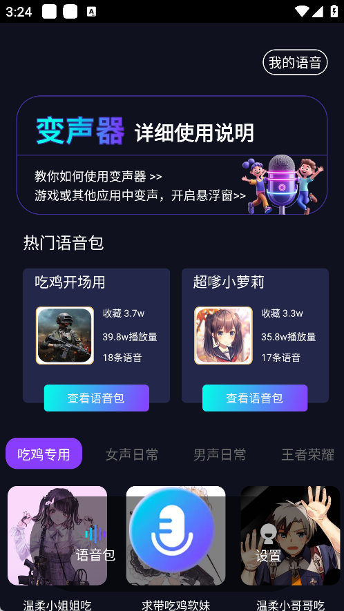 2、这里提供的语音包很多,有吃鸡专用、女声日常、男声日常 、王者荣耀、我是歌手、怼人等等类别。